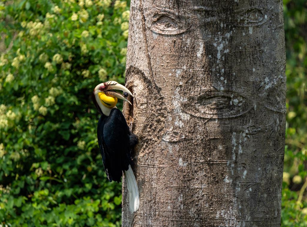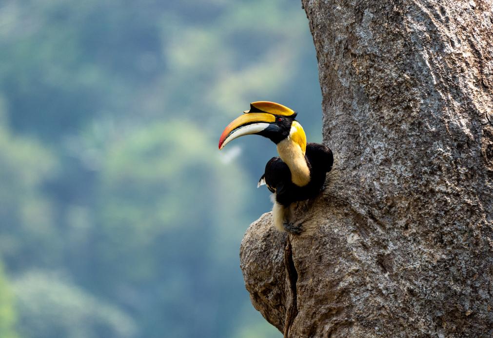 低沉有力的振翅声打破寂静,一只长着黄色巨嘴的大鸟从河谷方向飞来。它收起超过一米的艳丽双翼,落在树冠上,环顾四周后才跃上大树的树洞口,上下甩动脖颈,占了身长近1/3的大嘴也不断抖动——这是滇西雨林中一只衔食归来的雄性双角犀鸟。