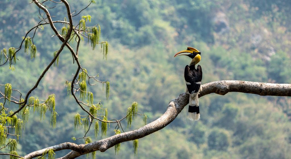 在盈江县,人们观察到中国已知的5种犀鸟,双角犀鸟是其中之一。当地考察评估后在保护区内选取了数个隐蔽监测点,面向观鸟爱好者和研究人员开放,盈江县观鸟协会会长班鼎盈说,观赏犀鸟主要集中在每年2月中旬至6月,进入保护区需办理许可证,遵循管理规则。