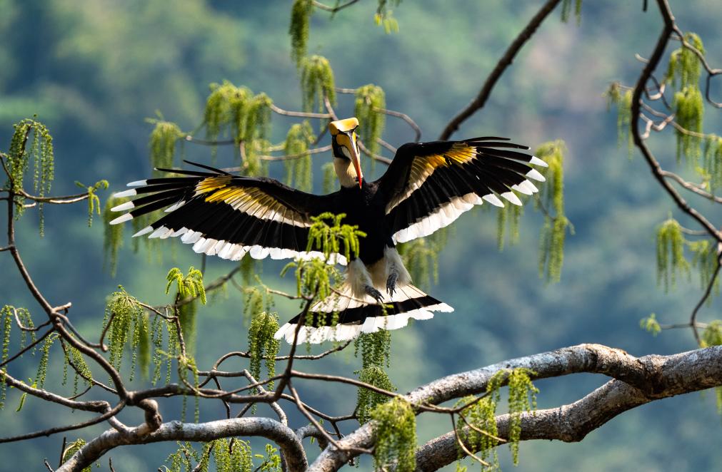 云南铜壁关省级自然保护区管护局盈江管护分局副局长金银德介绍,通过持续推进犀鸟物种及繁殖巢穴调查,2023年保护区“犀鸟谷”范围内监测发现犀鸟巢穴26巢,2022—2023年间,每年犀鸟个体数量增长大于20只。