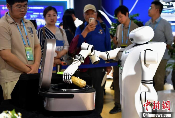 图为峰会现场体验区会煮饭的机器人吸引参观者。 中新网记者张斌摄