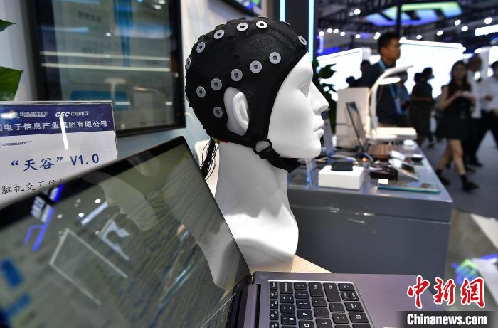图为峰会现场体验区展示的脑机交互信号采集系统。 中新网记者张斌摄