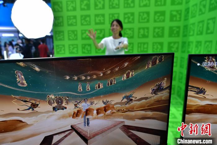 图为参观者在峰会现场体验区体验展示的XR演播厅。 中新网记者张斌摄