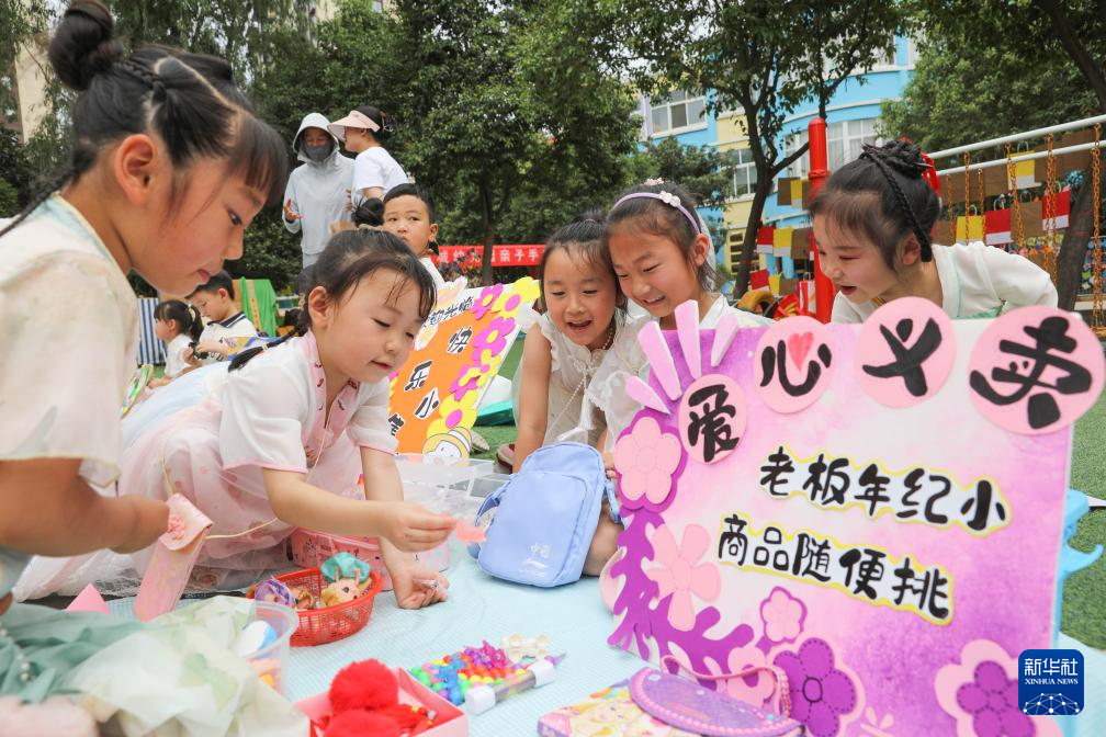 5月30日,河南省宝丰县东城幼儿园小朋友参加创意集市活动。