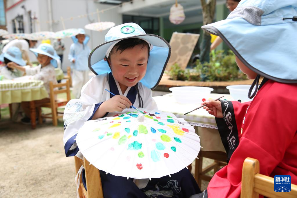 5月29日,江苏省淮安市洪泽区机关幼儿园小朋友在画“伞画”。