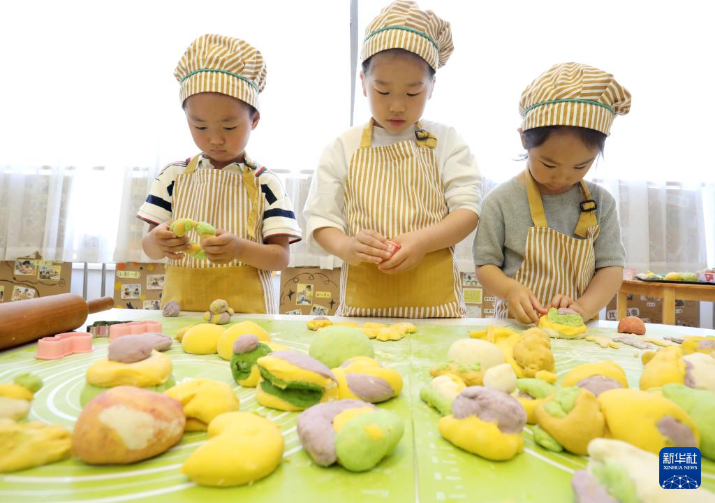 5月29日,在江苏苏州工业园区东兴路幼儿园,小朋友在制作点心。