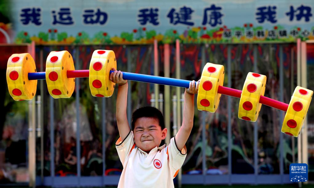 5月28日,在山东省邹平市韩店镇中心幼儿园,一名男孩在活动中“举重”。