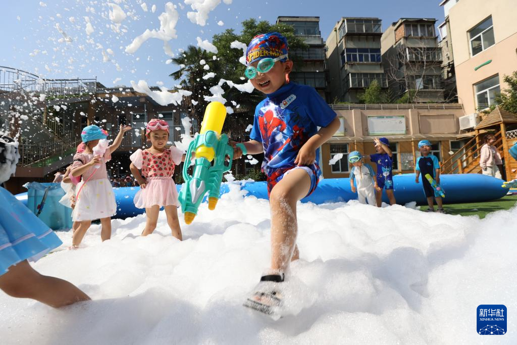 5月28日,河南省开封市西小阁幼儿园的小朋友在泡沫里玩耍。