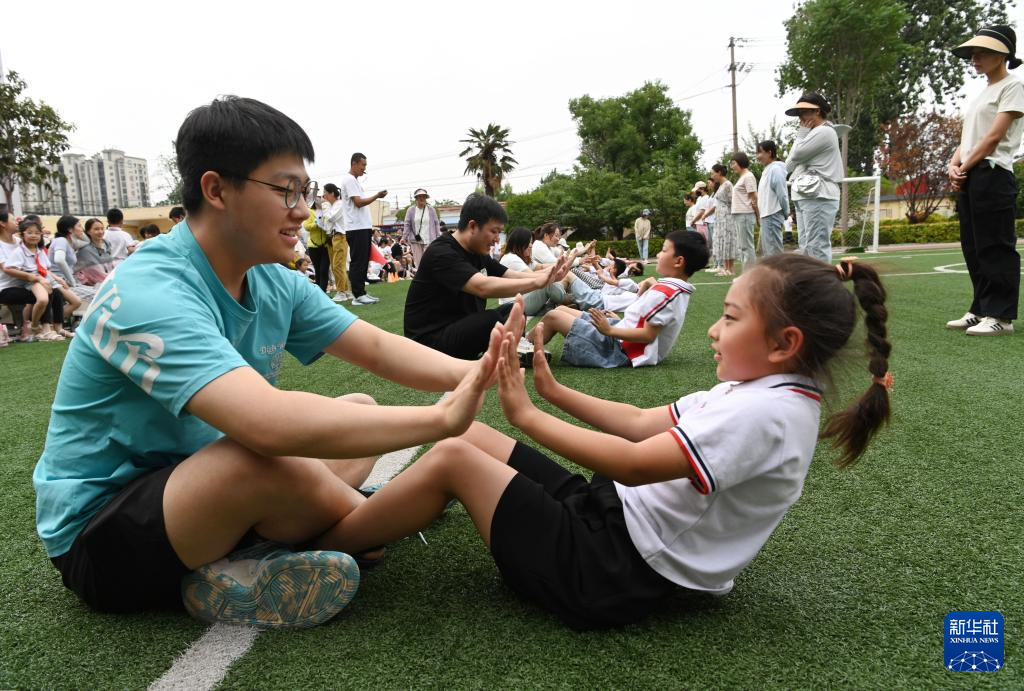 5月29日,河南省沁阳市第二小学举办亲子运动会,学生和家长一起参加“仰卧击掌”趣味比赛。
