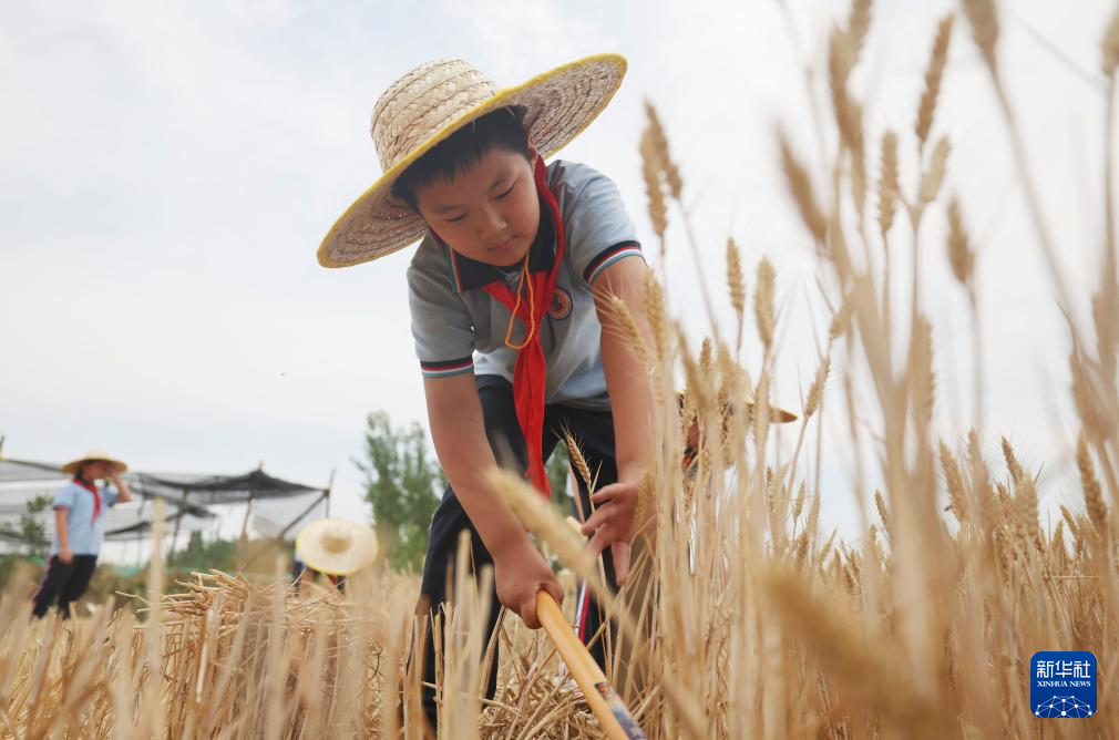 5月29日,山东省临沂市沂南县苏村镇中心小学学生在麦田里体验收割小麦。