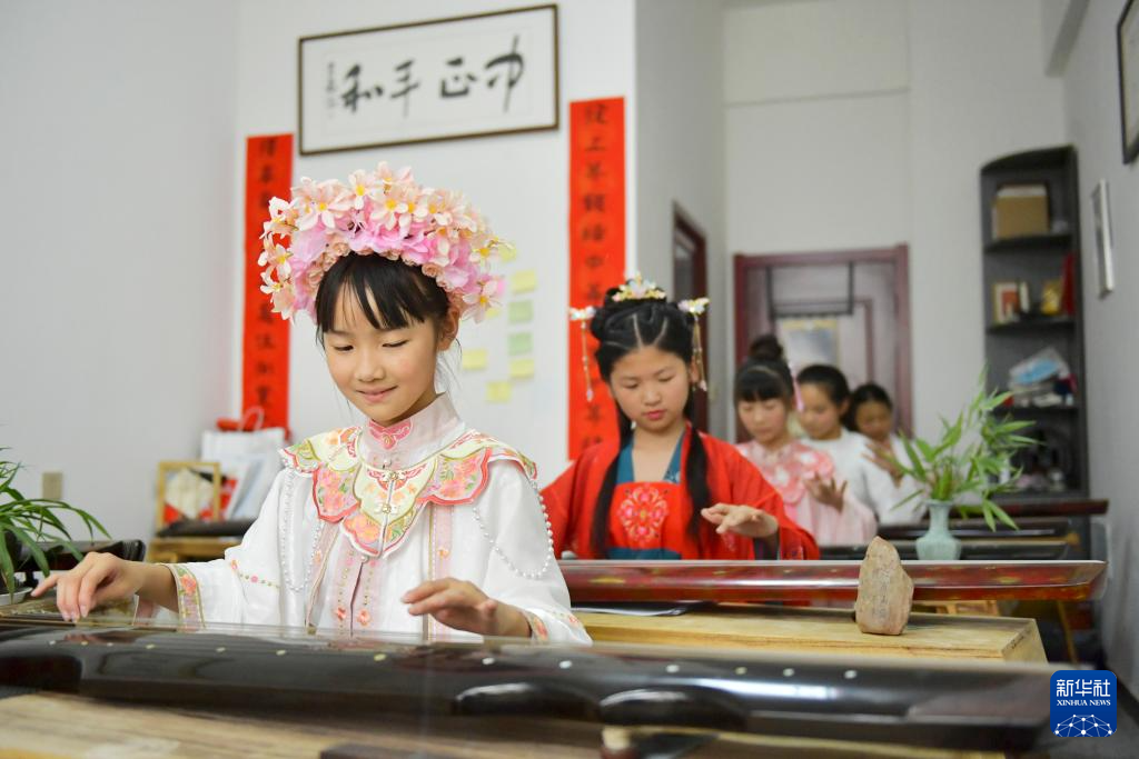 5月29日,在河南省夏邑县非遗古琴传习所,孩子们练习弹奏古琴。