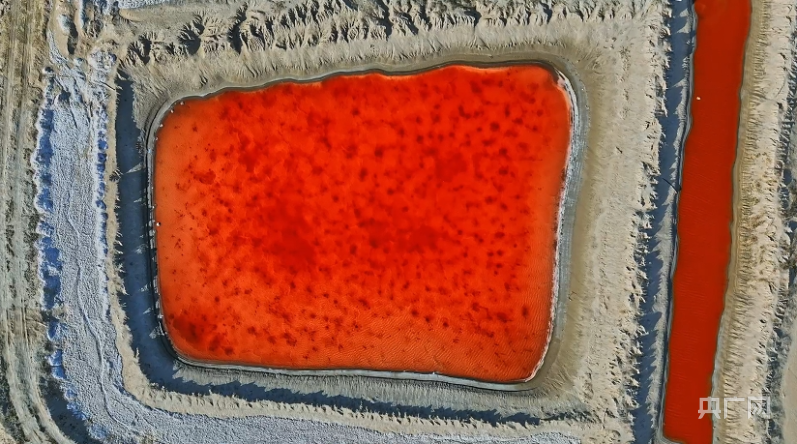 抬头是“画”,入目是“景”。这片盐湖位于乌审旗乌审召毛敦查干淖尔,湖面被自然分割成多个区域,每块区域都处于不同的产盐阶段,因此拥有各自独特的水体生态系统和水化学成分。这些差异导致了湖水呈现出不同的色彩,从深蓝、翠绿到粉红、金黄,犹如调色盘上的色彩一般丰富多彩。