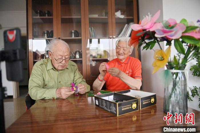 6月4日,在长春市双阳区一家养老院,栾秀春(右)和赵光在直播做丝网花。今年91岁的栾秀春和93岁的丈夫赵光,虽已步入鲐背之年,却仍然怀着一颗年轻的心。他们在身体允许的情况下,会通过直播向网友介绍自己的晚年生活和养老、保健、健身等方面的体会。张瑶 摄