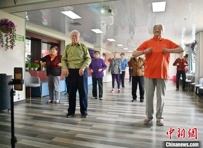 6月4日,在长春市双阳区一家养老院,栾秀春(右)和赵光(右二)在直播做保健操。今年91岁的栾秀春和93岁的丈夫赵光,虽已步入鲐背之年,却仍然怀着一颗年轻的心。他们在身体允许的情况下,会通过直播向网友介绍自己的晚年生活和养老、保健、健身等方面的体会。张瑶 摄