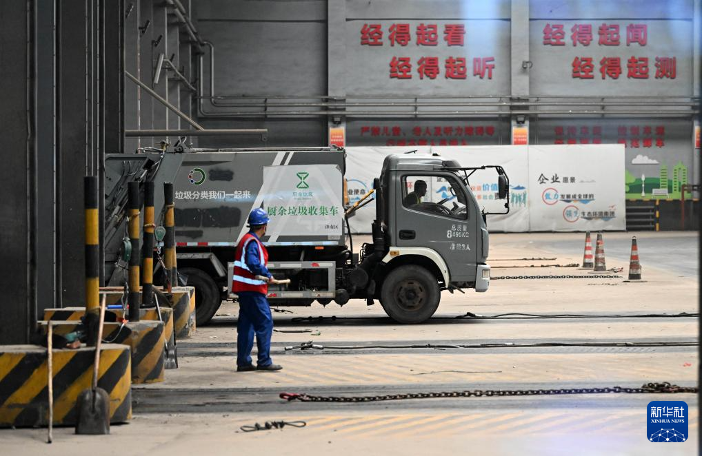 6月4日,工作人员驾驶垃圾运输车往垃圾仓里倾倒垃圾。