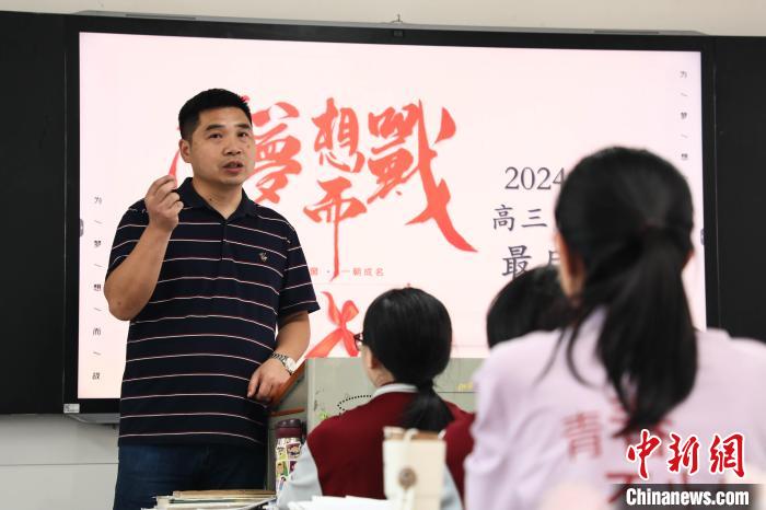 6月5日,在江西省南昌市第一中学高三年级的教室里,充满欢笑与祝福的高中“最后一课”生动上演,课堂上,有老师对学生的鼓励,也有学生对老师的感激,高三学子们在轻松愉快的氛围中结束了高中的“最后一课”,准备迎接高考。图为班主任正在为学生们上最后一节班会课。刘思伟摄