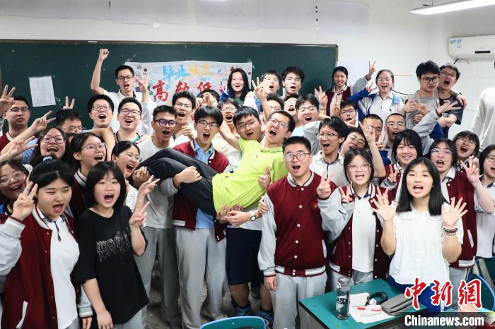 6月5日,在江西省南昌市第一中学高三年级的教室里,充满欢笑与祝福的高中“最后一课”生动上演,课堂上,有老师对学生的鼓励,也有学生对老师的感激,高三学子们在轻松愉快的氛围中结束了高中的“最后一课”,准备迎接高考。图为学生们将班主任举起庆祝高中毕业。刘思伟摄