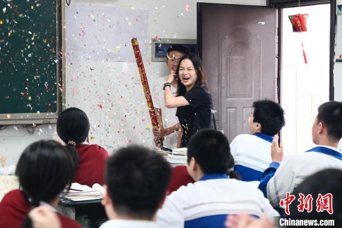 6月5日,在江西省南昌市第一中学高三年级的教室里,充满欢笑与祝福的高中“最后一课”生动上演,课堂上,有老师对学生的鼓励,也有学生对老师的感激,高三学子们在轻松愉快的氛围中结束了高中的“最后一课”,准备迎接高考。图为学生们正在与老师拥抱道别。刘思伟摄