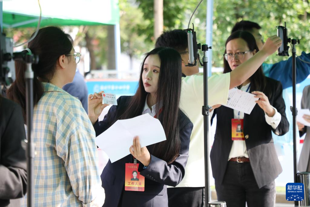 6月7日,在甘肃兰州市第十四中学考点,工作人员核验考生证件。