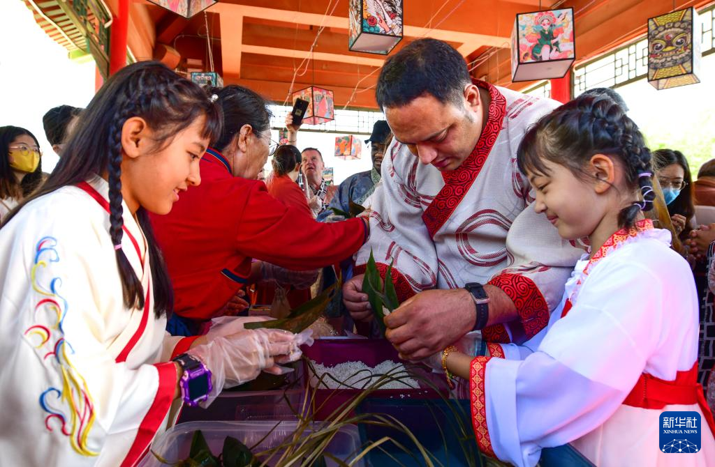 6月7日,一场主题为“品端午文化之韵赏交流互鉴之美”主题游园会在内蒙古鄂尔多斯市康巴什区举行。这是身着汉服的巴基斯坦游客山姆·汗父女三人在游园活动中体验包粽子。