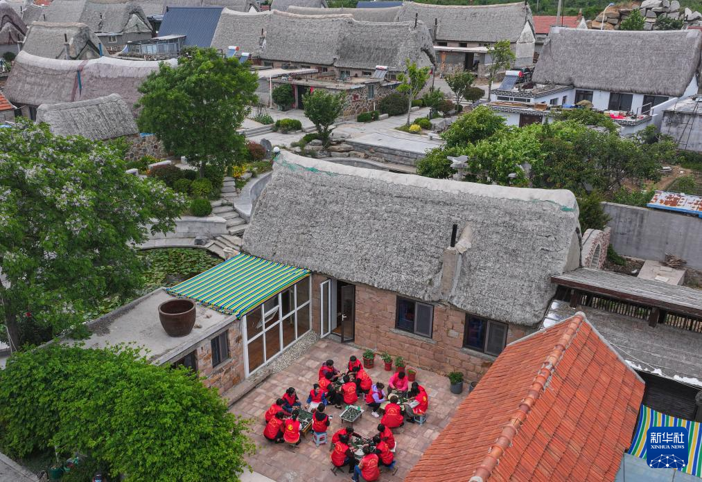 6月7日,在山东省荣成市俚岛镇大庄许家村暖心食堂,志愿者为村里老人包粽子(无人机照片)。