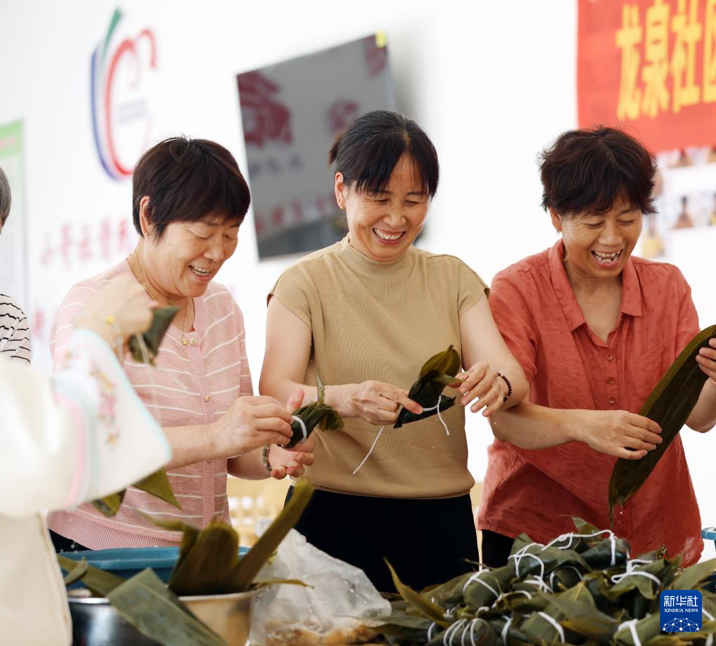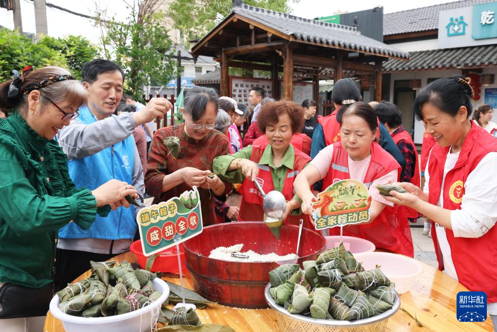 6月7日,浙江省湖州市德清县乾元镇东郊社区幸福邻里中心开展“端午粽飘香幸福邻里情”活动。这是志愿者和居民一同包粽子。