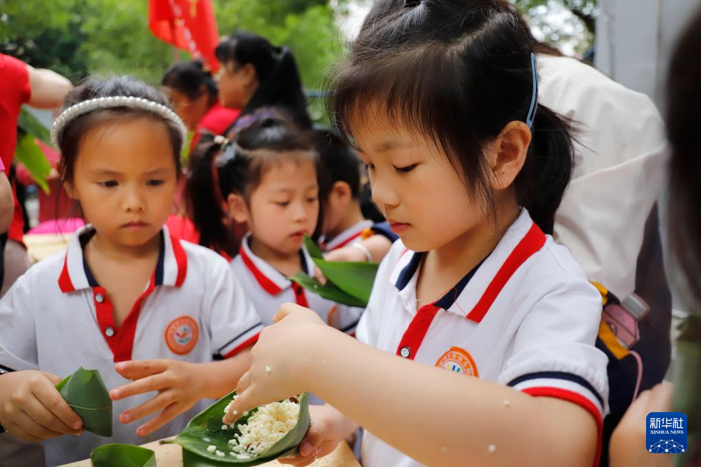 6月7日,在湖南省怀化市鹤城区城中街道新街社区,小朋友们学习包粽子。