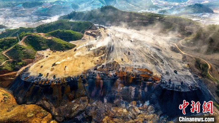 图为邱家忠作品《再造山河》。2023年6月5日,钦州市灵山县旧州镇石桥村,山道上一辆辆工程车满载着土方来往于山谷平整场。广西文联供图