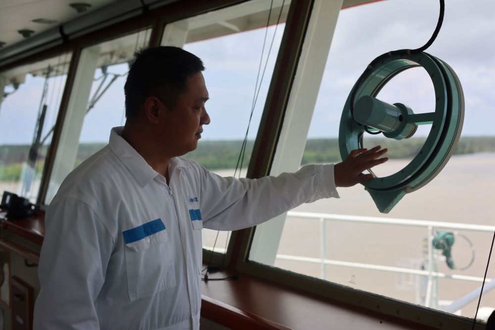 6月6日,在哥伦比亚巴兰基亚,中交上海航道局的“航浚6009”轮船长胡钊章在控制室工作。新华社记者 周盛平 摄
