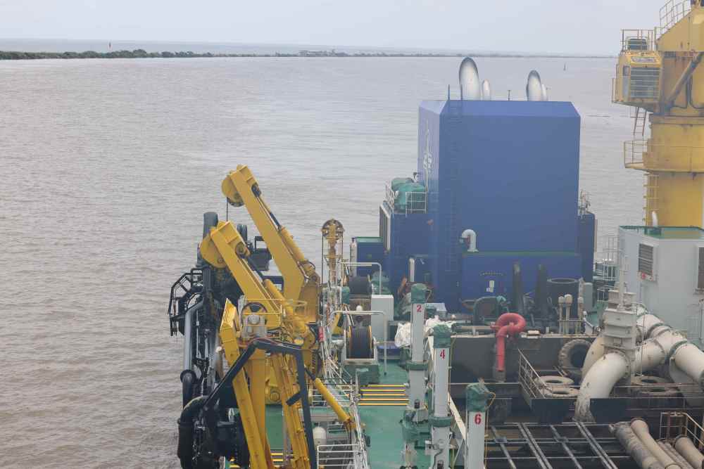 6月6日,在哥伦比亚巴兰基亚,中交上海航道局的“航浚6009”轮在马格达莱纳河入海处作业。新华社发(中交上海航道局供图)
