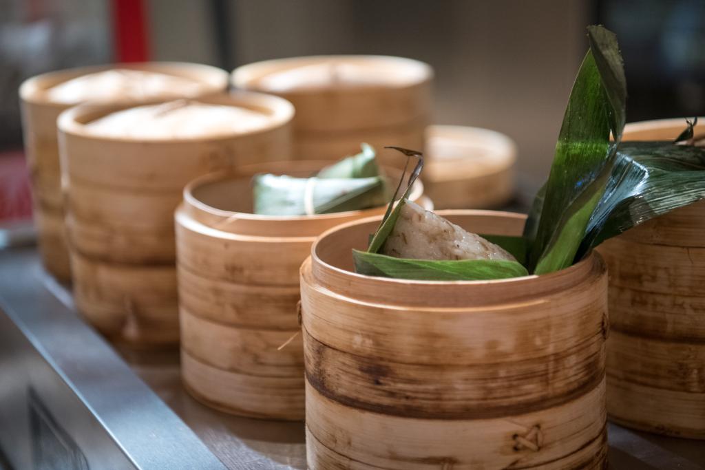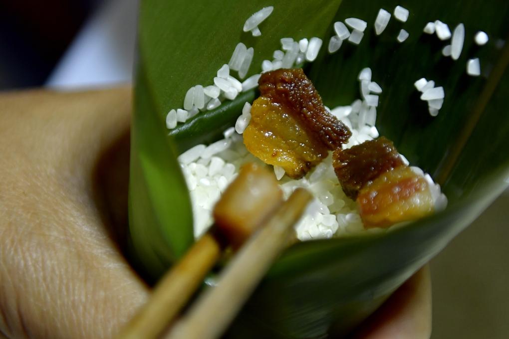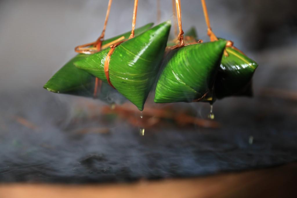2017年5月24日,湖北省宣恩县板场村农民制作腊肉粽子。
