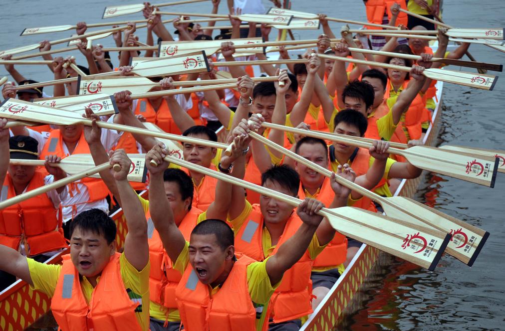 2011年6月6日,在河南省郑州东区的如意湖上,举行了一场龙舟挑战赛,两支龙舟队的选手们在比赛开始前举桨大吼以壮气势。