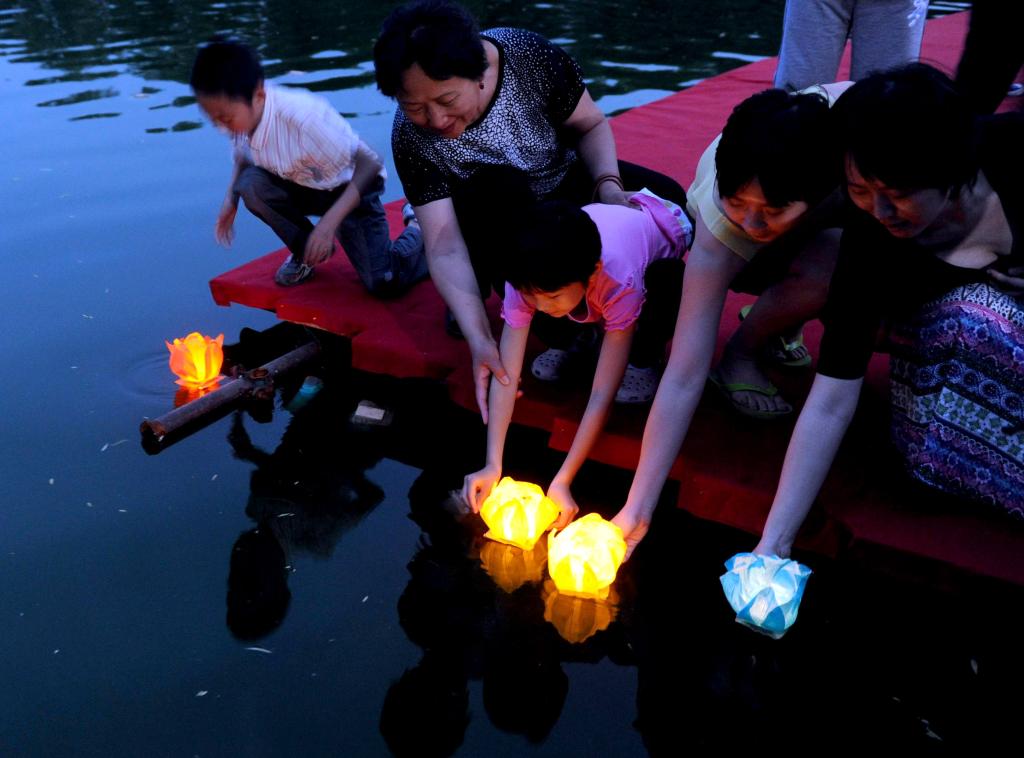 2011年6月4日,游客在北京龙潭公园参加端午节“祈福纳吉”放河灯活动。