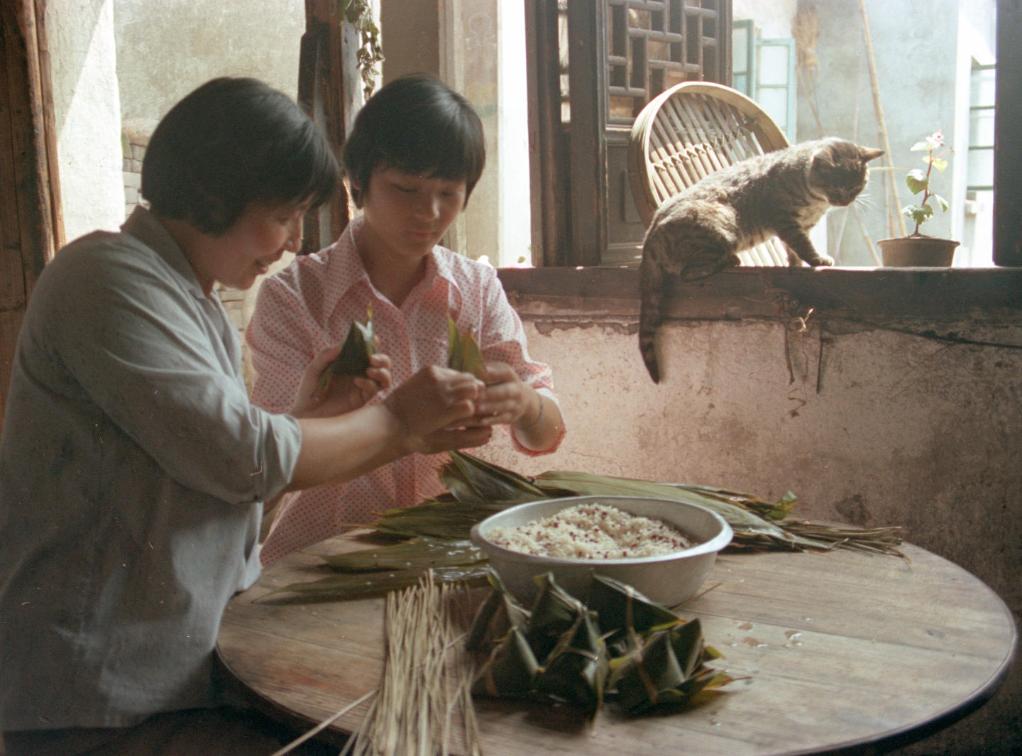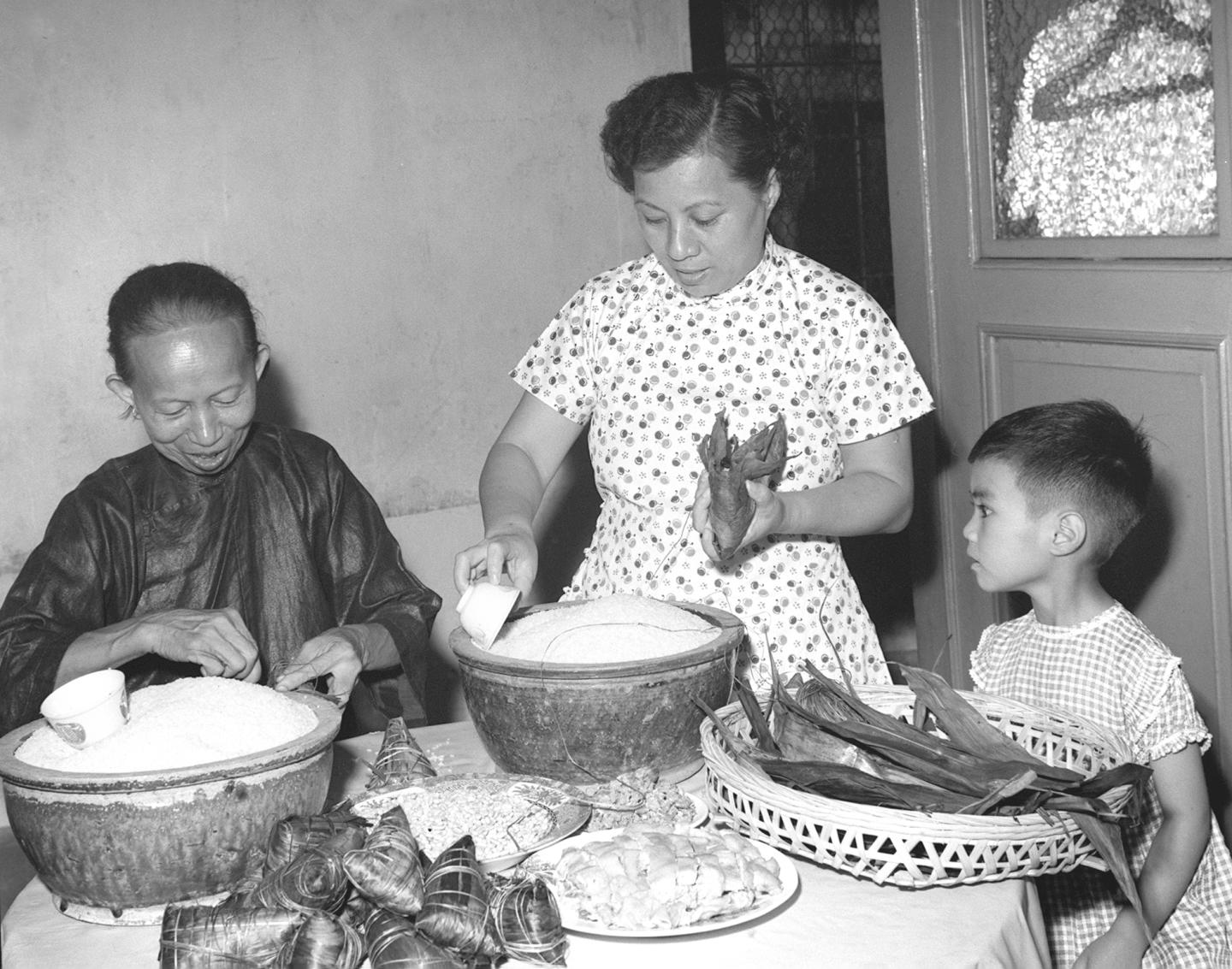 1955年,居住在广州市华侨眷属一家人在包粽子。