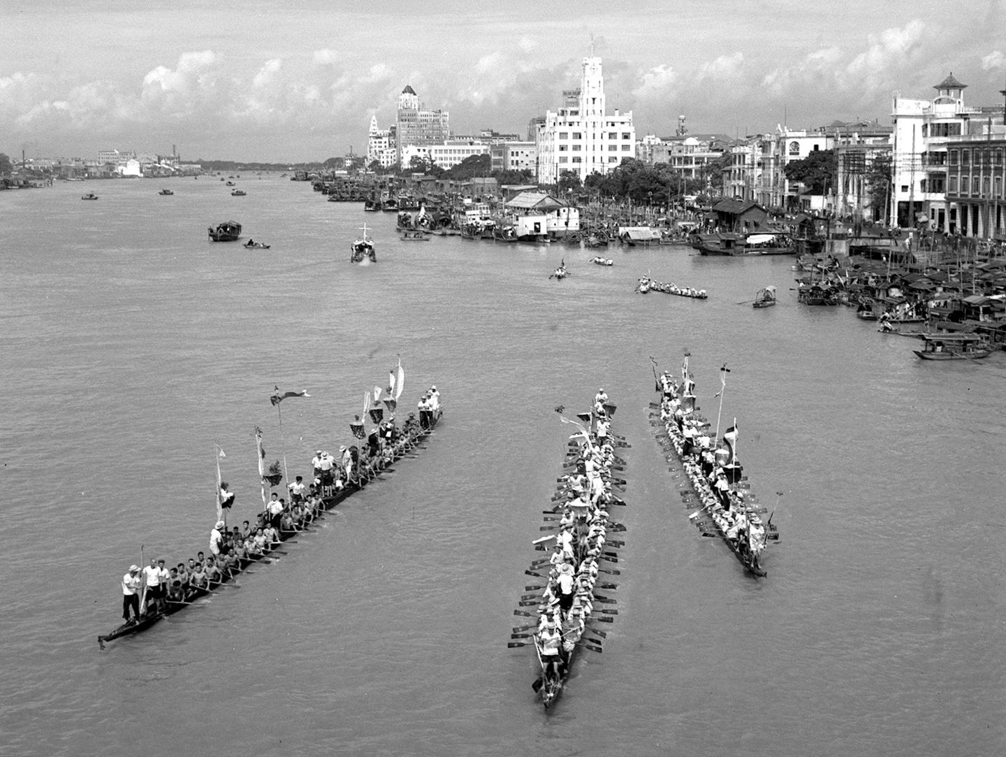 1955年,参加表演的龙舟经过广州市区的珠江水面。
