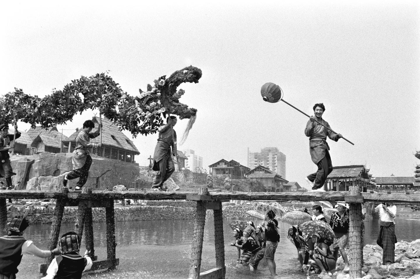 1995年6月2日,羌族青年在北京的中华民族园表演“飞龙过江”。