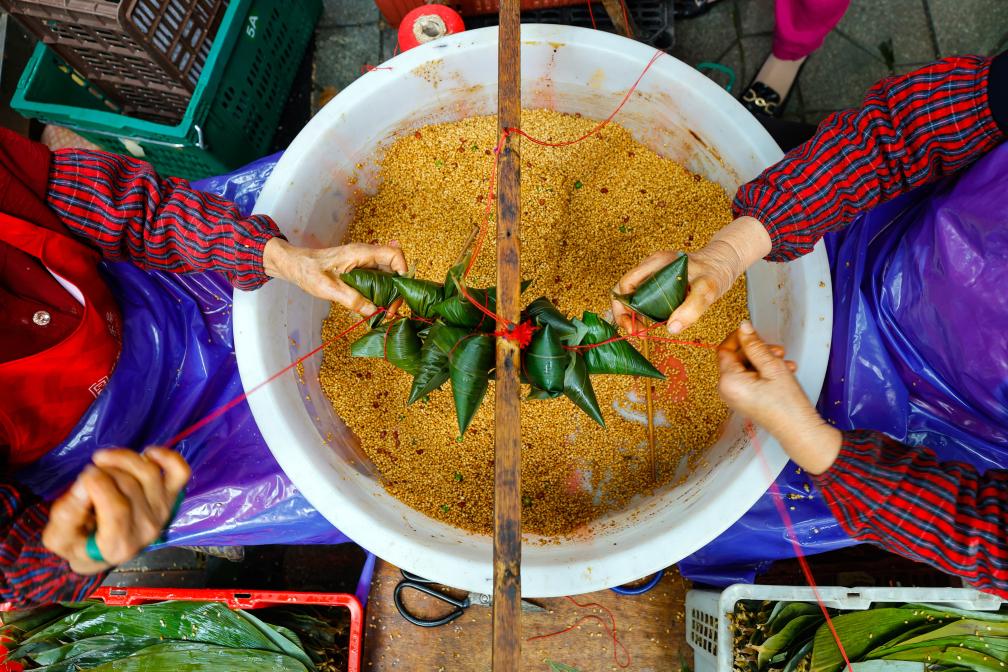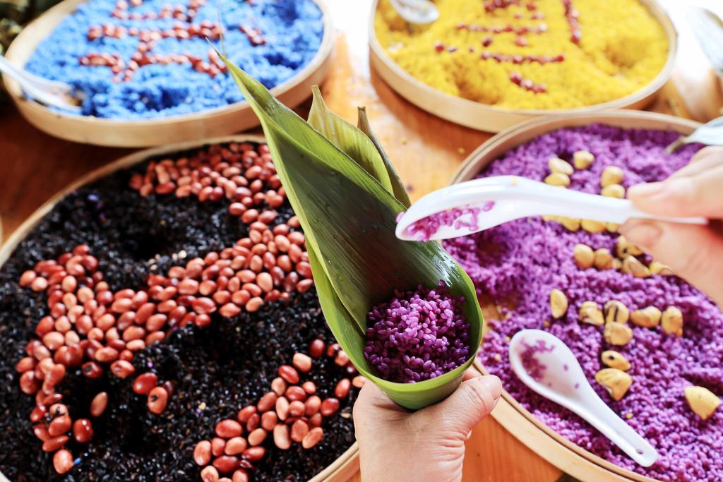 2022年5月25日,在广西融安县雅瑶乡章口村西古坡屯,壮族村民在制作五彩粽,这是用山上生长的红蓝草、苏木等植物煮水取汁后将糯米染色制成的。