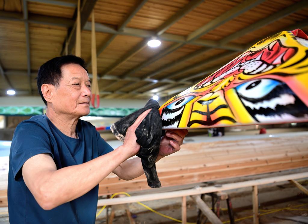 2024年6月3日,福州市非物质文化遗产“方庄龙舟制造技艺(闽侯县)”的传承人方绍晃在擦拭准备交付的龙舟船头。方庄村是福建远近闻名的“龙舟村”,制造龙舟的技艺已传承了700多年,每年有200余艘传统龙舟销往全国及海外。方绍晃介绍说,制作一艘福州传统龙舟从原料选择到制作都非常讲究,主要选取闽北山区树龄40年以上的杉木和樟木为原材料,历经做龙骨、钉底板、装鱼梁、抛光、画花、上油漆等多道工序,最后装上精心雕刻的龙头才算大功告成。
