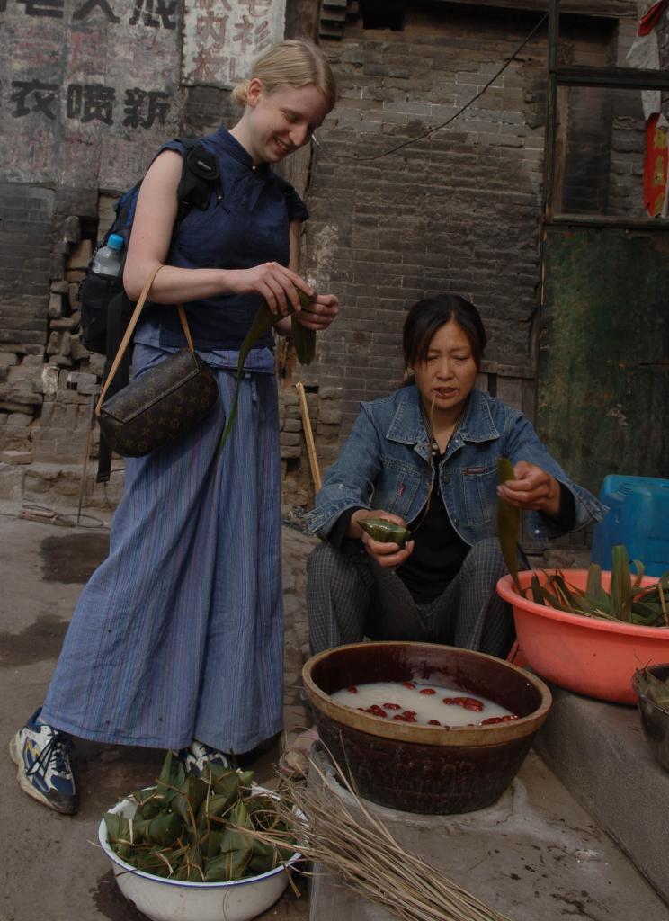 2006年5月31日,在山西省平遥县街头,一名外国游客在学习包粽子。