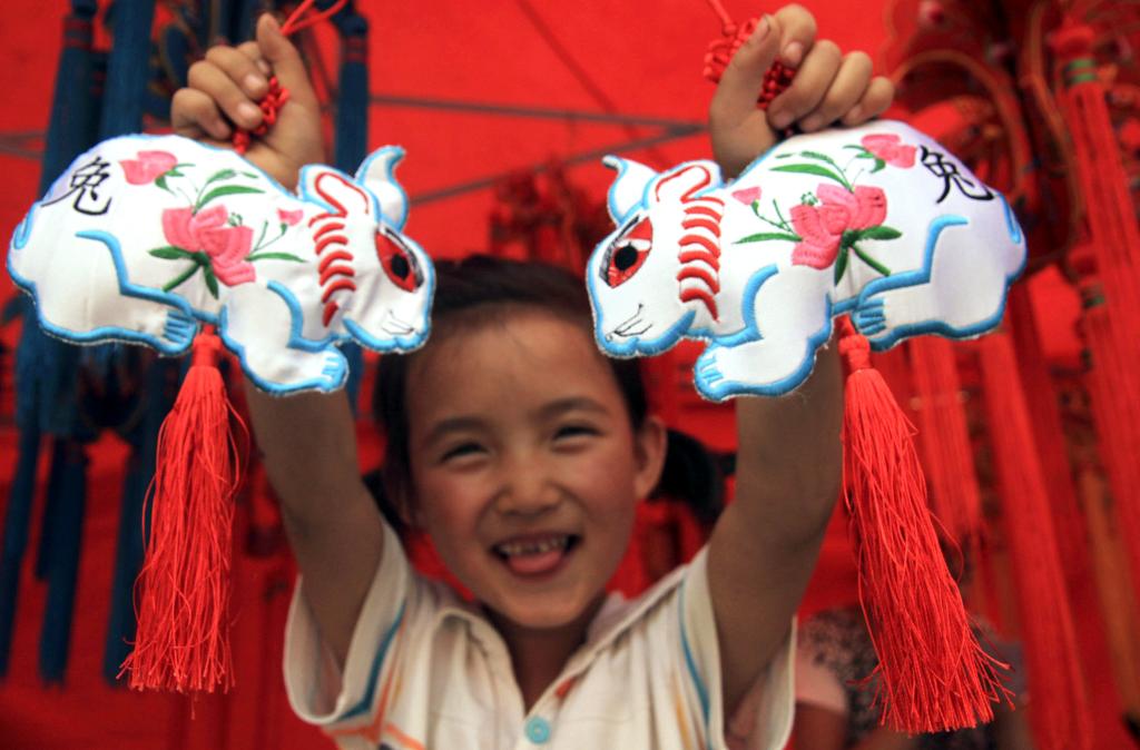 2011年6月5日,在有“香包之乡”之称的甘肃庆阳香包民俗文化节香包展棚里,一名小朋友展示玉兔香包。