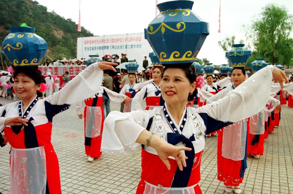 2002年6月15日,人们在吉林省吉林市举行第二届朝鲜族端午民俗艺术节上表演“顶水舞”。