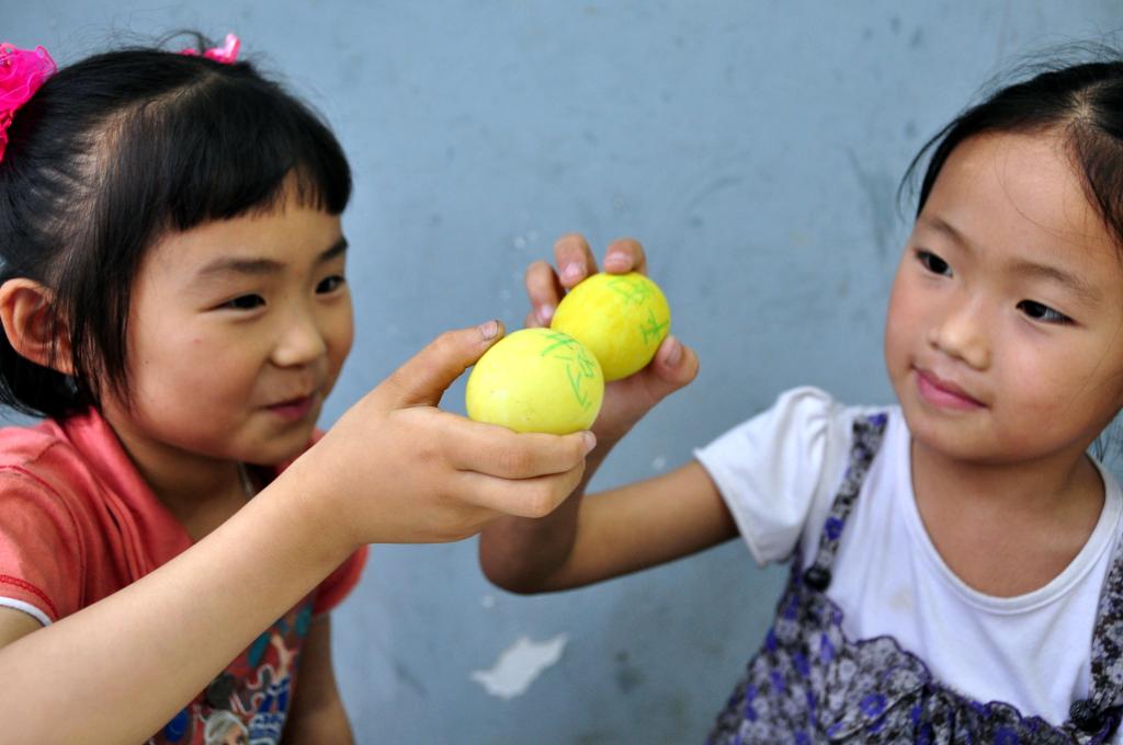 2010年6月13日,福建省莆田市城厢区第一实验小学举行端午节传统习俗“撞虎蛋”体验活动。学生们在经五味草煮过的鸭蛋上写下愿望,然后两两相撞,共祈今后更加平安、健康、聪明。这是两位学生拿着写有各自愿望的“虎蛋”相撞。