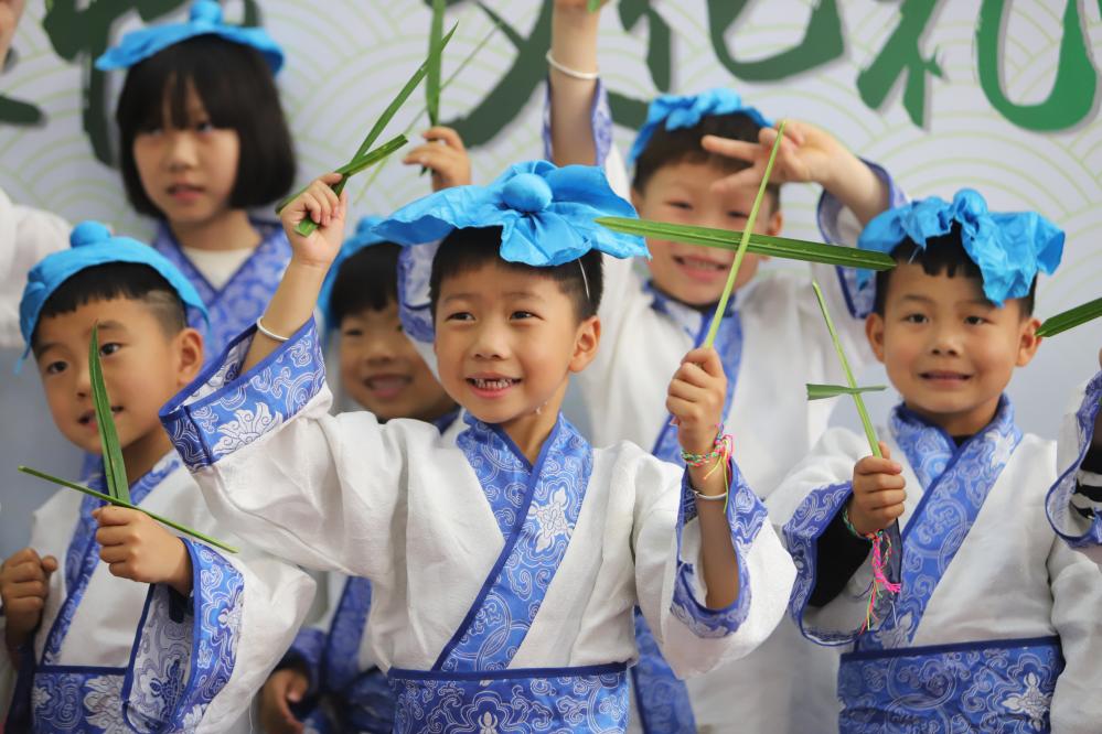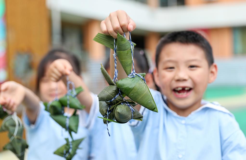 2024年6月5日,四川省华蓥市杜家坪幼儿园的小朋友展示自己包的粽子。