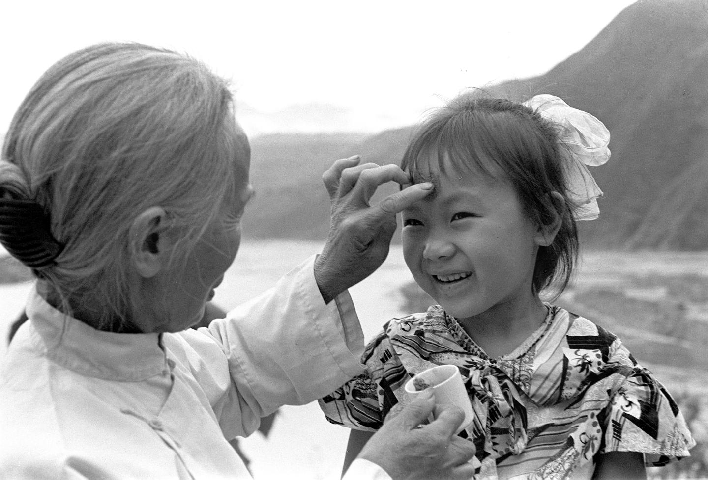 1982年,湖北秭归的一位老人给小孙女点雄黄。每逢端午节,给小孩额头点上用酒浸过的雄黄,表示可以驱毒避邪、平安幸福。