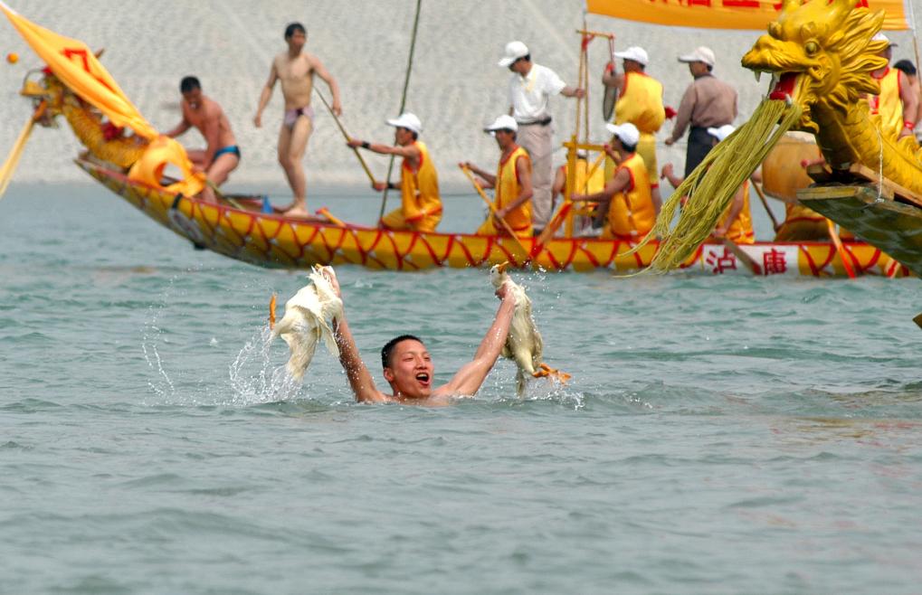 2006年5月2日,在陕西安康,一名参加汉江龙舟节抓鸭比赛的选手展示战果。