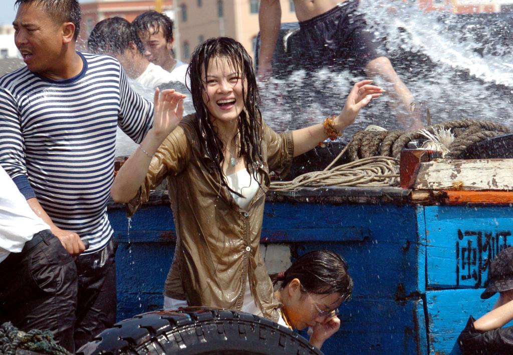 2005年6月11日,在福建省石狮市蚶江海域,一名女子参加一年一度的传统端午泼水节活动。