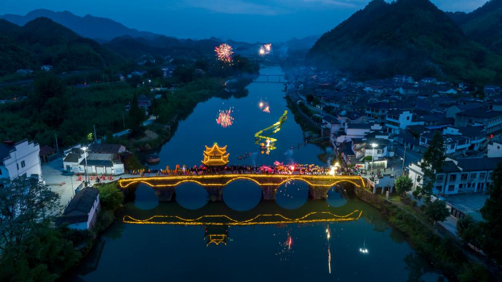 2023年6月16日,在安徽省宁国市胡乐镇,“鱼灯”“河灯”和“龙灯”相互辉映。胡乐镇的“鱼灯”“河灯”“龙灯”表演历史悠久,每逢佳节,村民们就自发组织起来在乡村巡回表演。