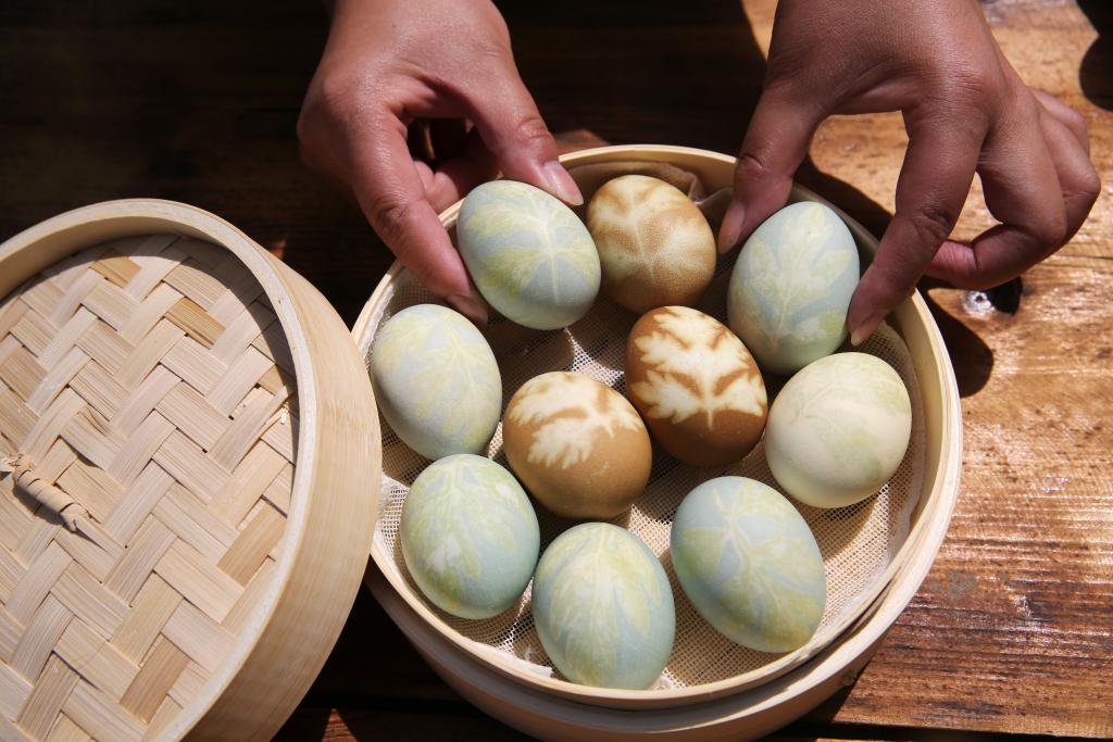 2022年5月28日,在江苏省连云港市连云区连岛街道,人们展示制作好的艾叶蛋。