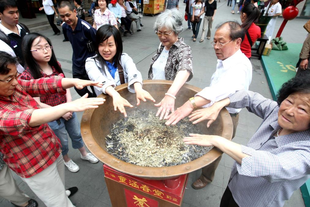 2009年5月26日,市民在上海豫园一家药店门口体验端午节的传统民俗——白芷熏香。