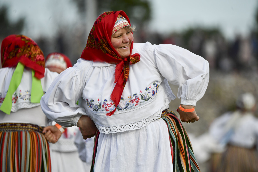 6月8日,在爱沙尼亚约赫维,一名妇女身着民族传统服饰参加舞蹈庆典。新华社发(谢尔盖·斯捷潘诺夫摄)