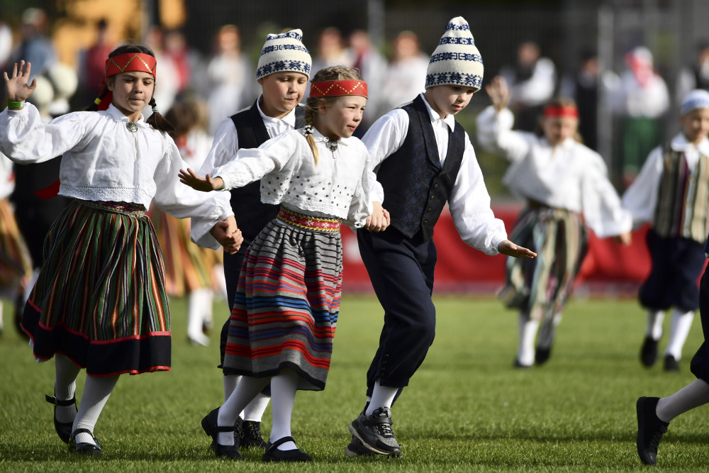 6月8日,在爱沙尼亚约赫维,孩子们身着民族传统服饰参加舞蹈庆典。新华社发(谢尔盖·斯捷潘诺夫摄)